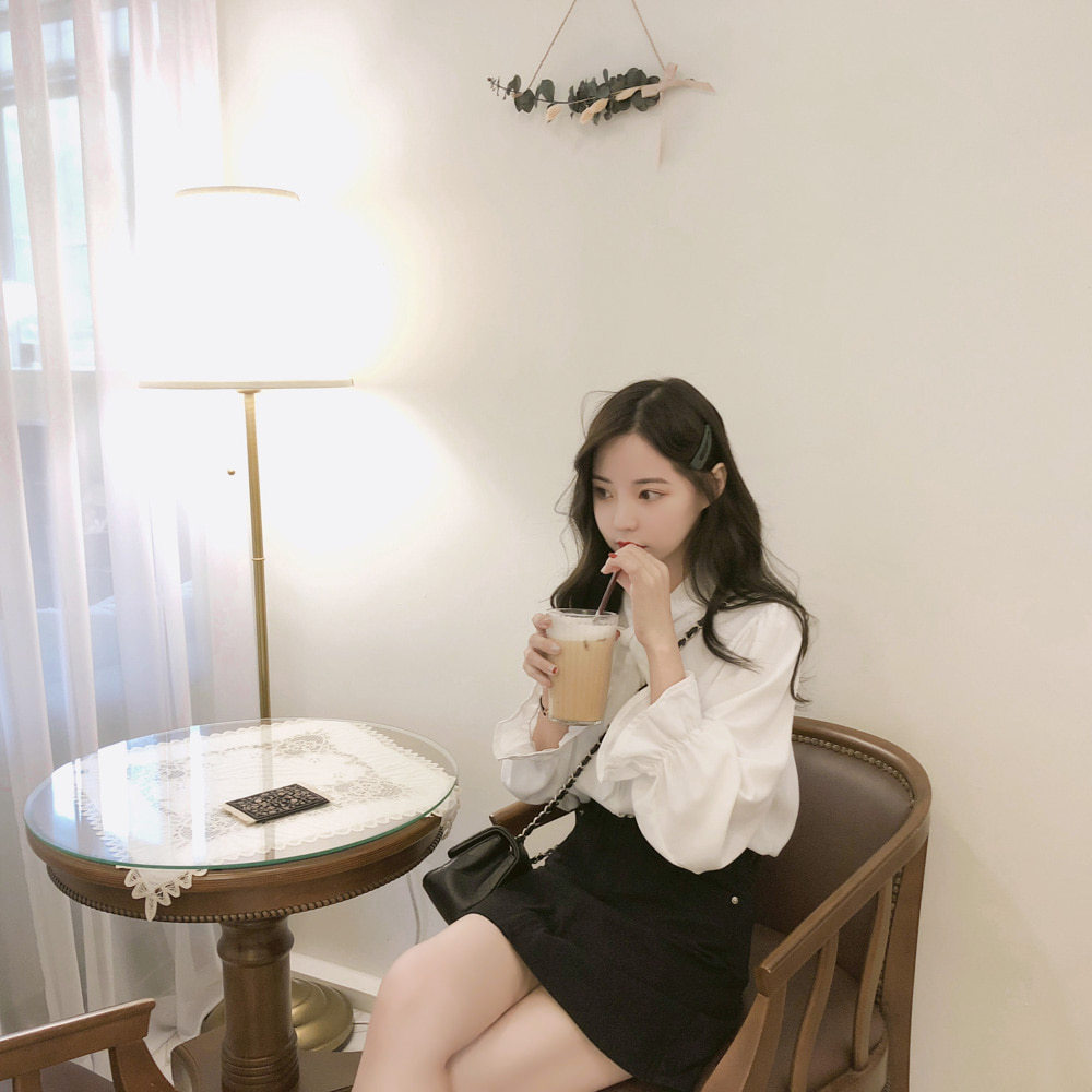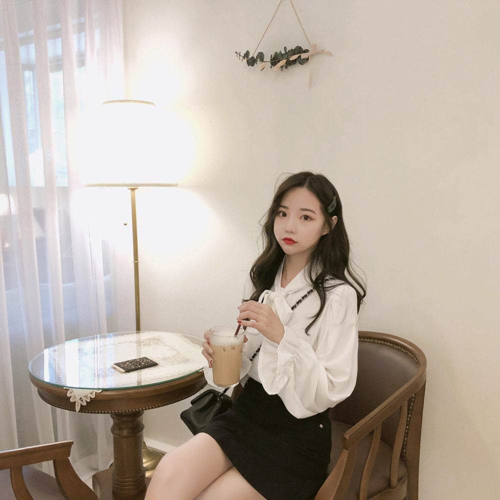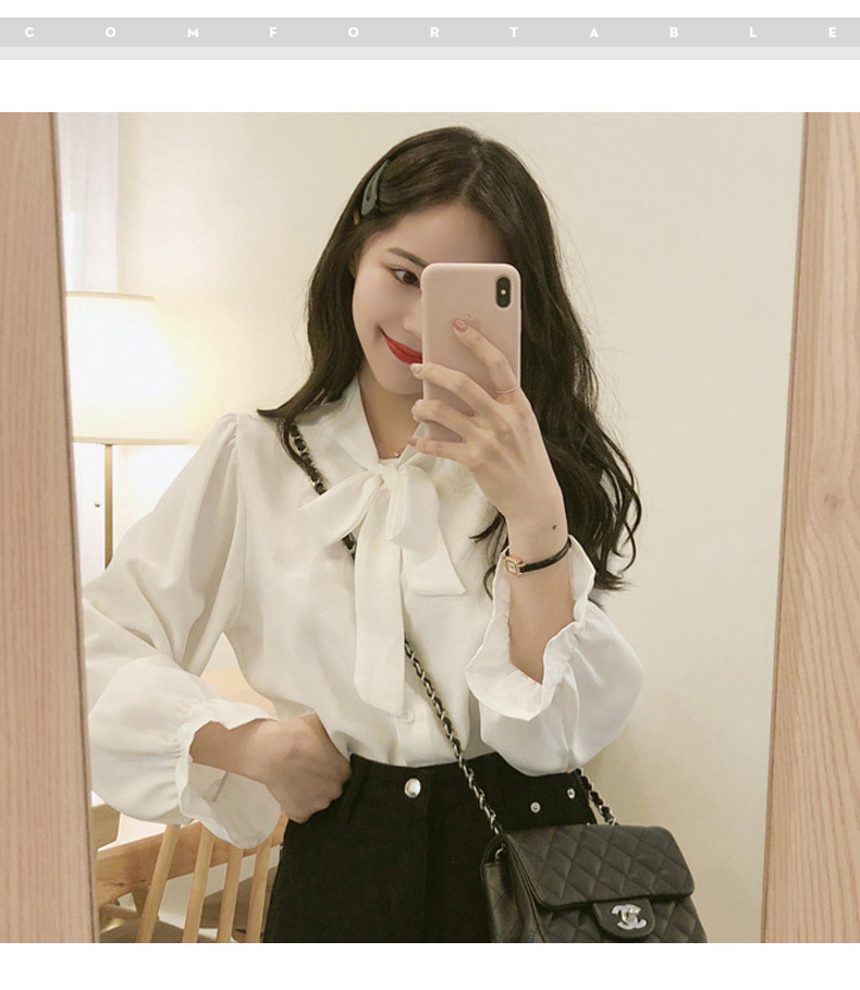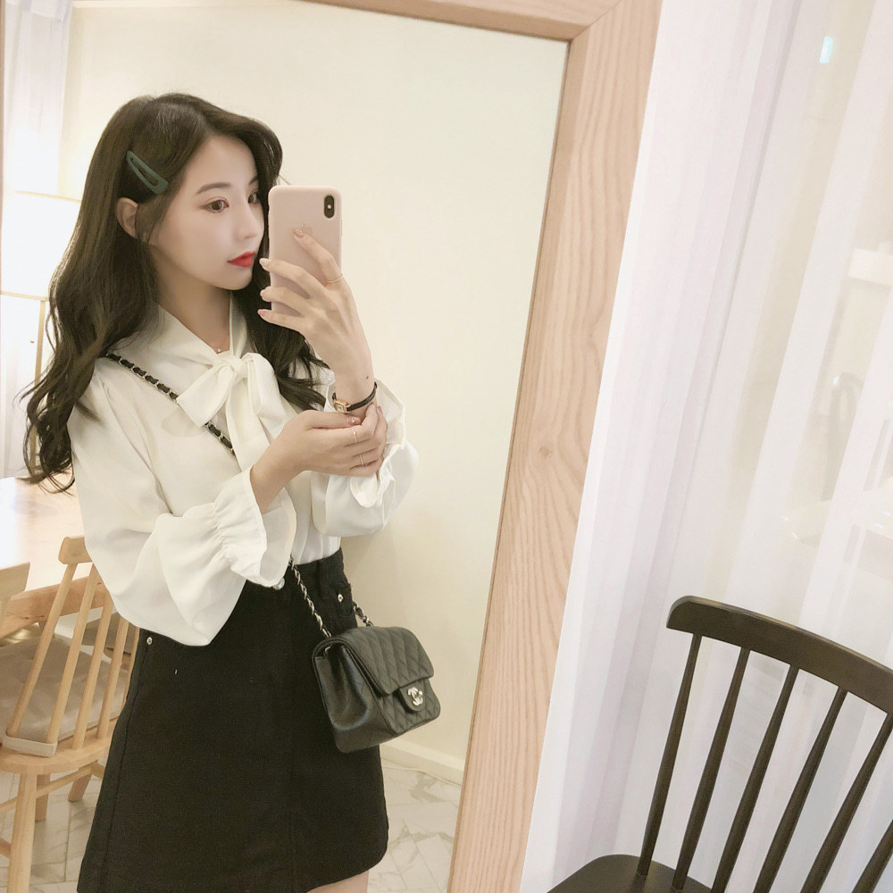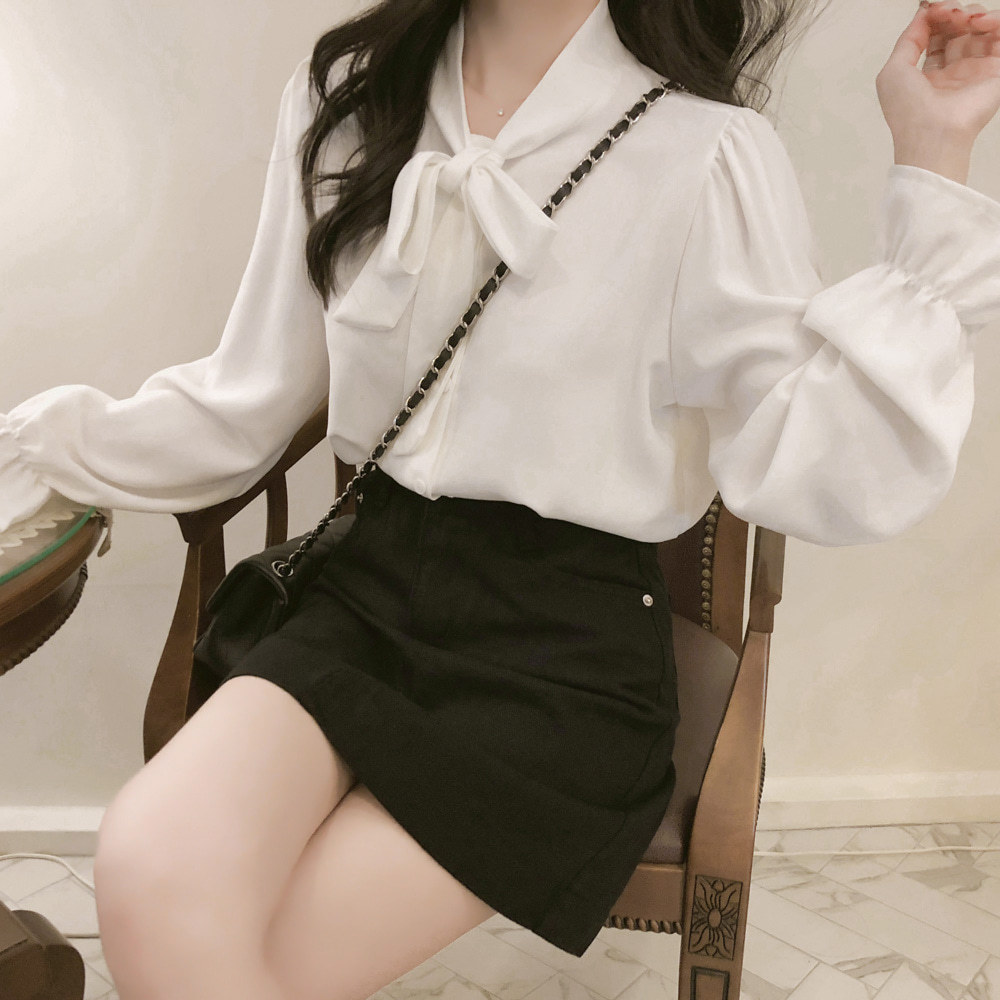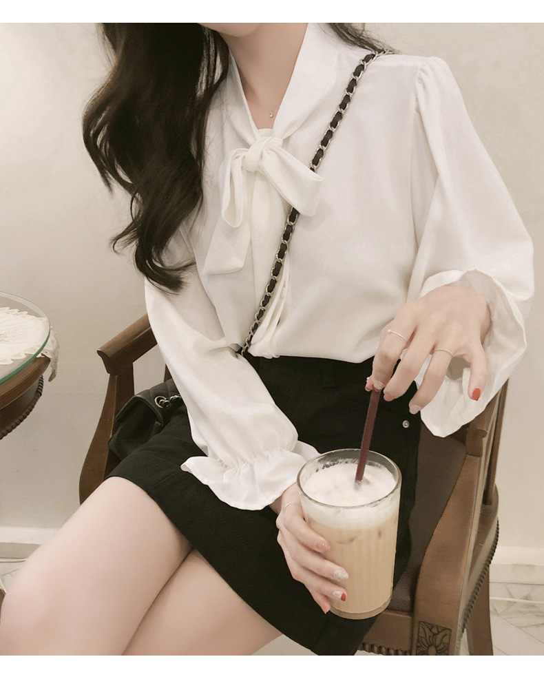New Hong Kong Style Retro Bow-neck Loose-fit Chiffon Long-sleeve Top