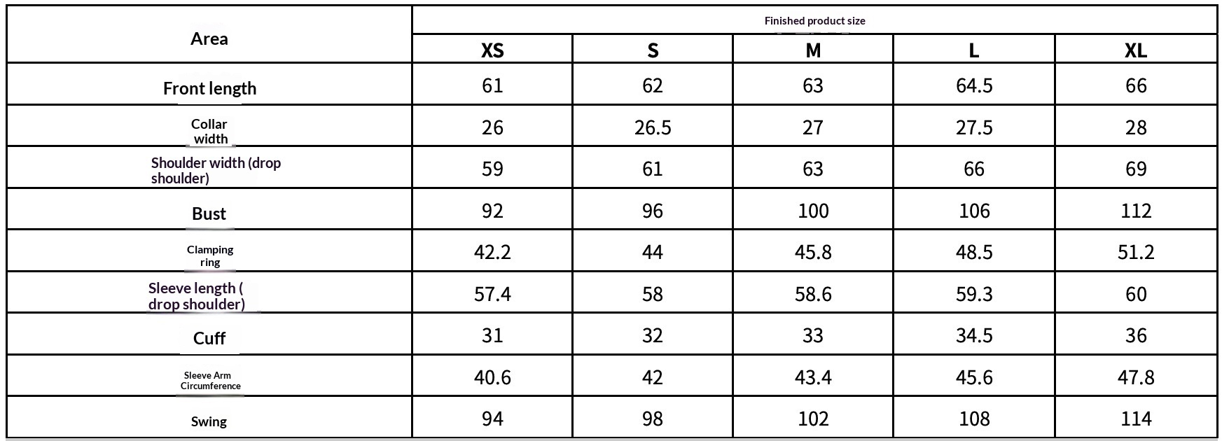 Sizes: XS, S, M, L, XL