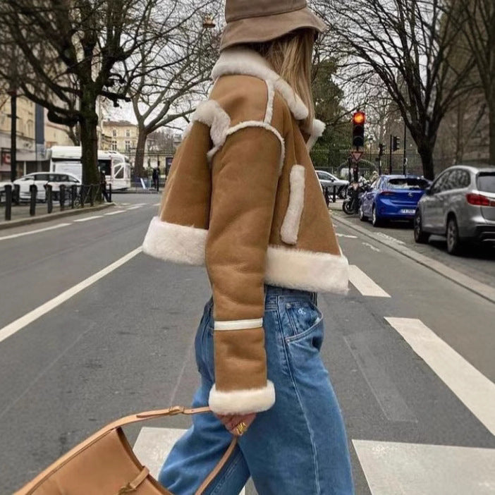 Autumn And Winter Plush Short Stitching Coat Fashion Casual Polo Collar Warm