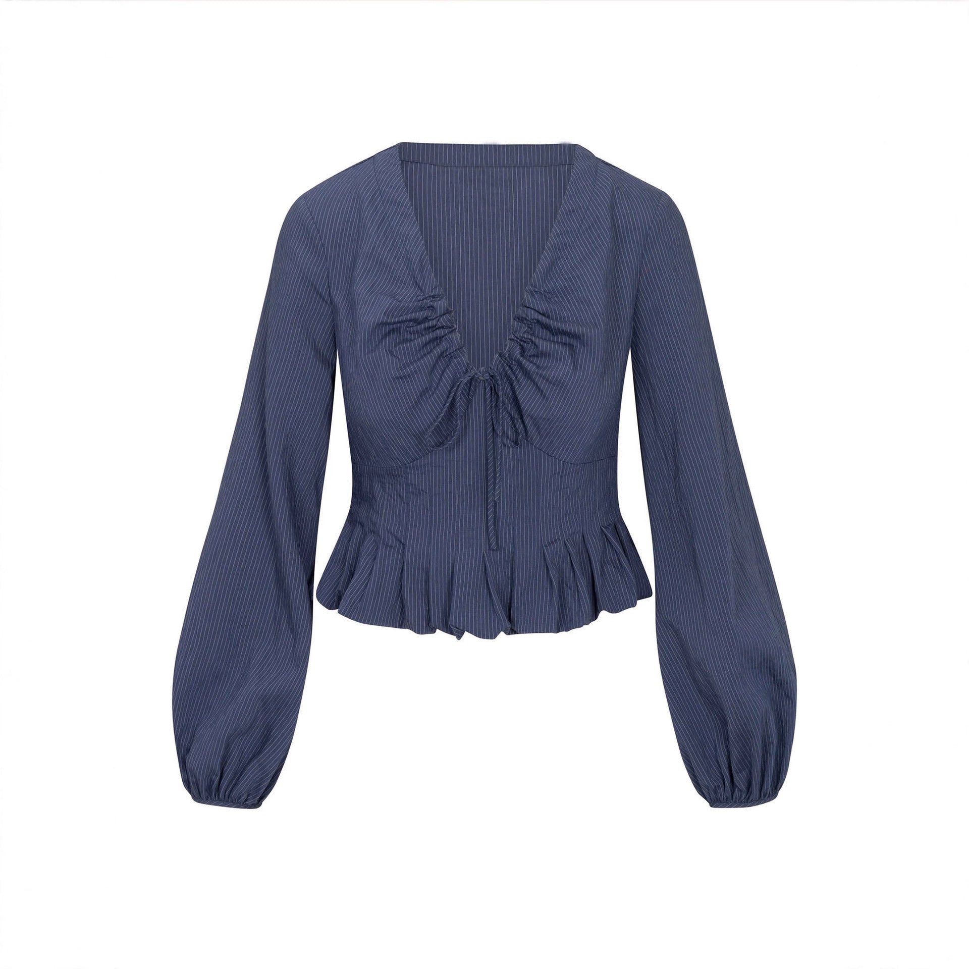 Gentle V-neck Top With Drawstring And Ruffled Hem Detailing