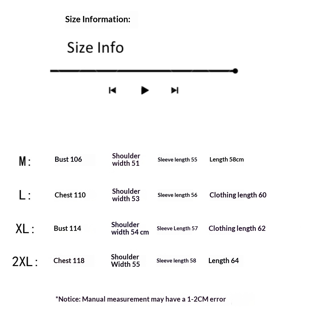 Sizes: M, L, XL, 2XL