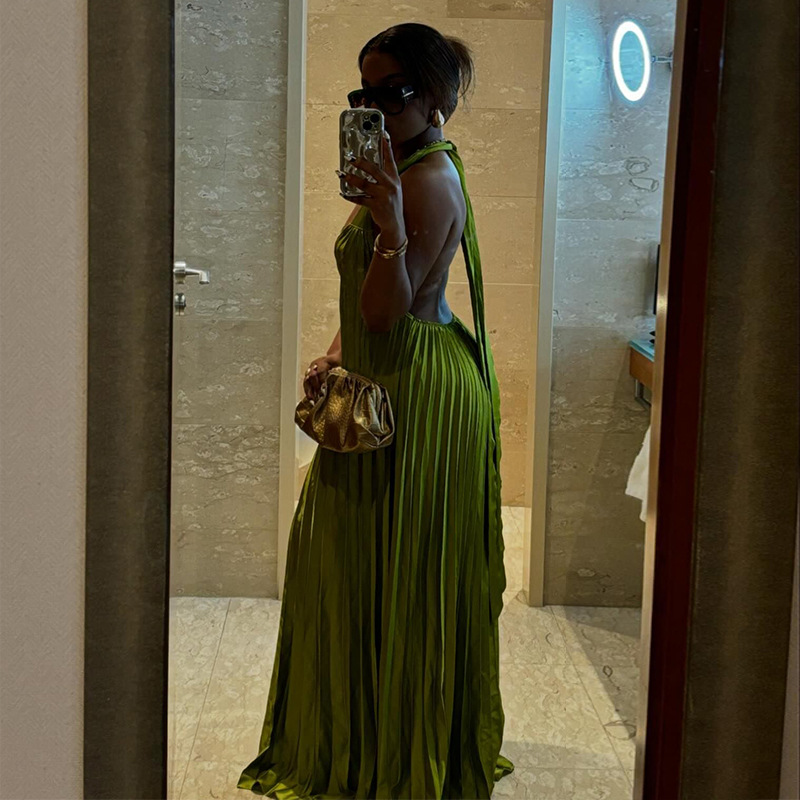 Sweet And Fresh Halter V-neck Backless Pleated Dress