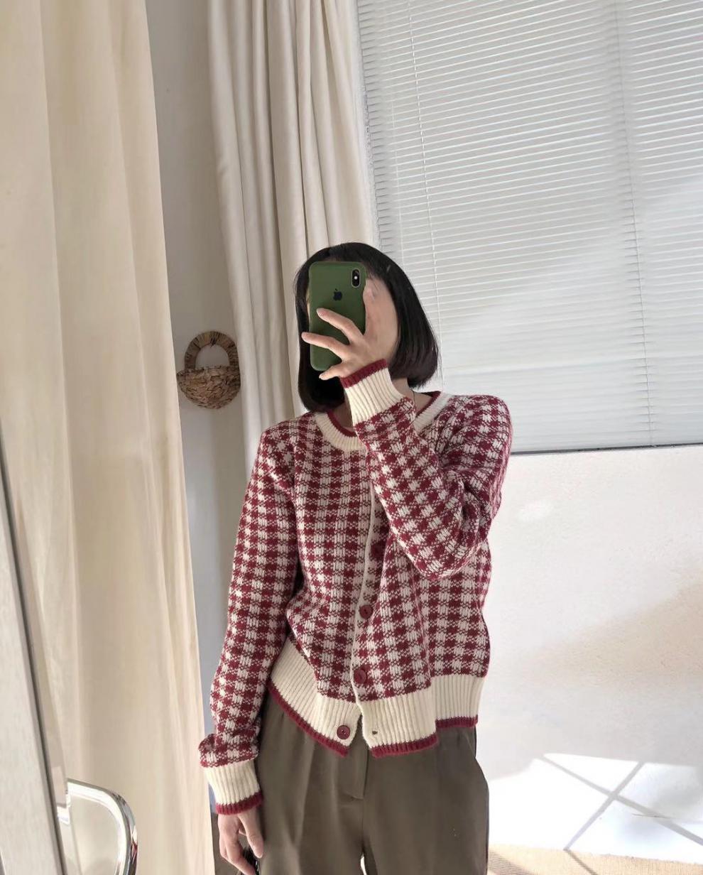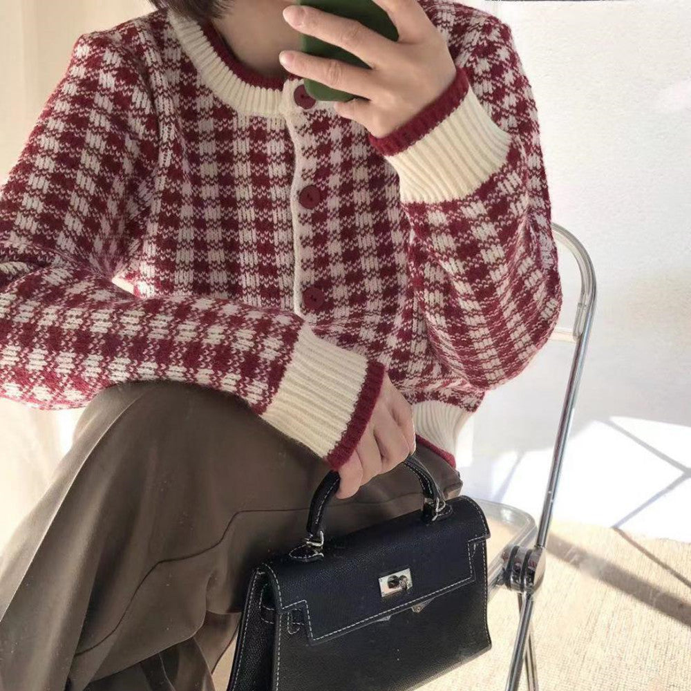 Vintage Simple Contrast Round Neck Plaid Knit Coat