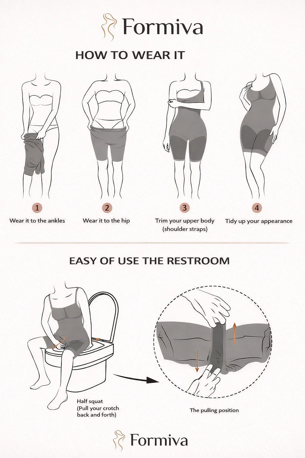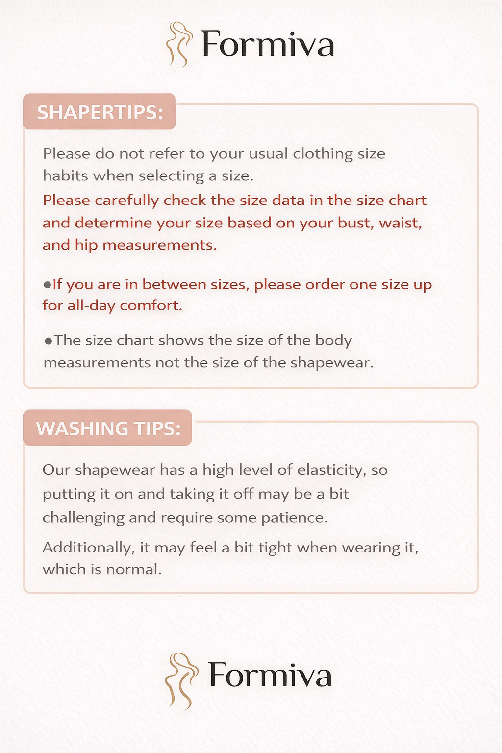 Measure your waist, bust, and hips to find your Formiva size. If your waist and hip measurements fall within different sizes, choose the larger size.