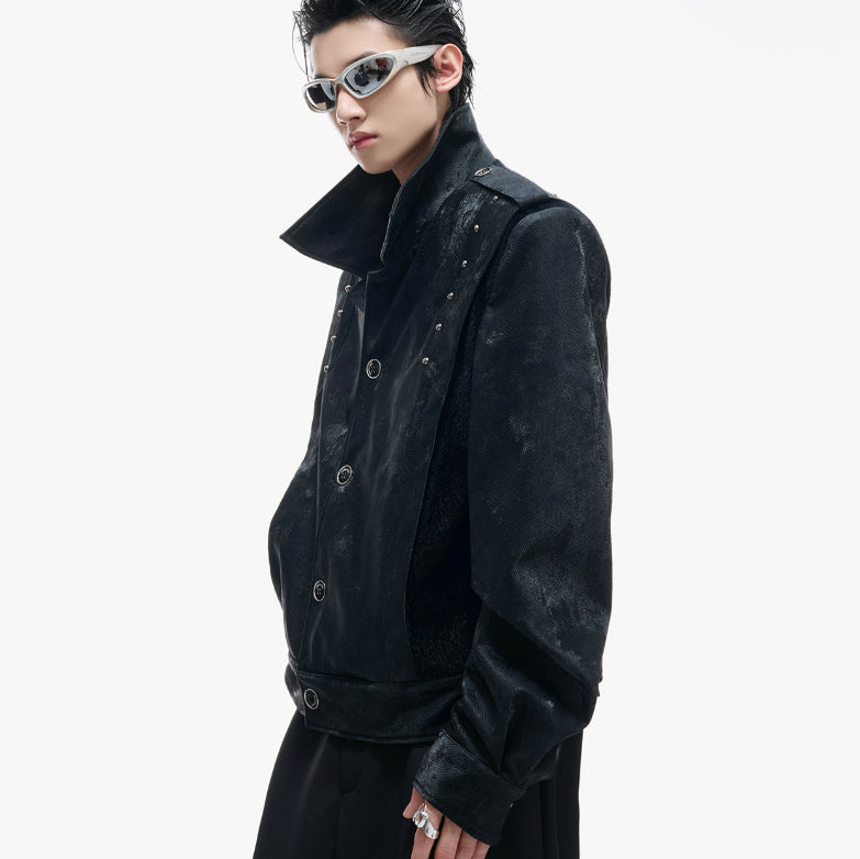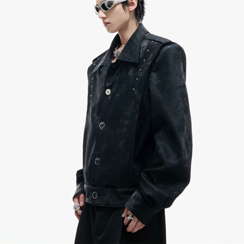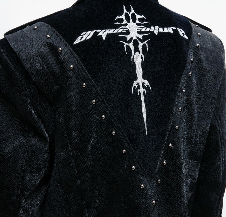Heavy Rivet Embroidered Design Leather Short Jacket