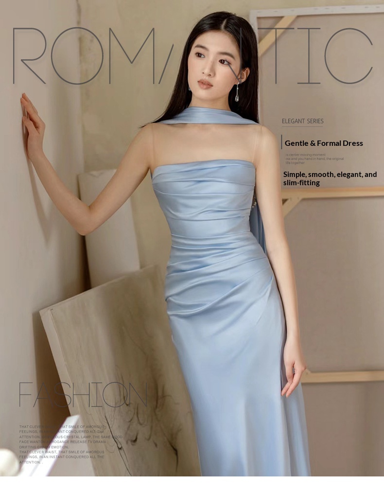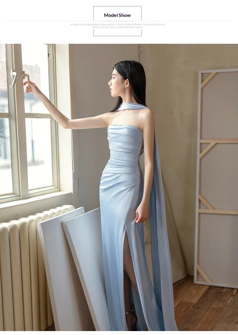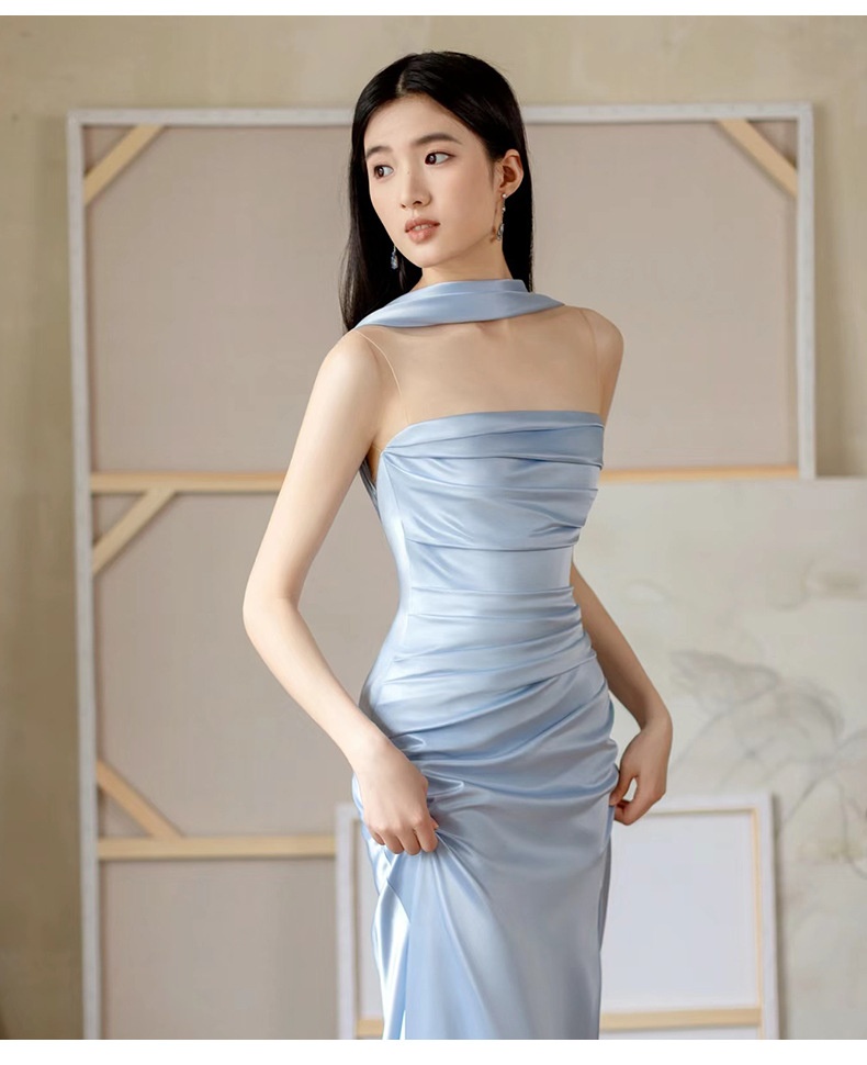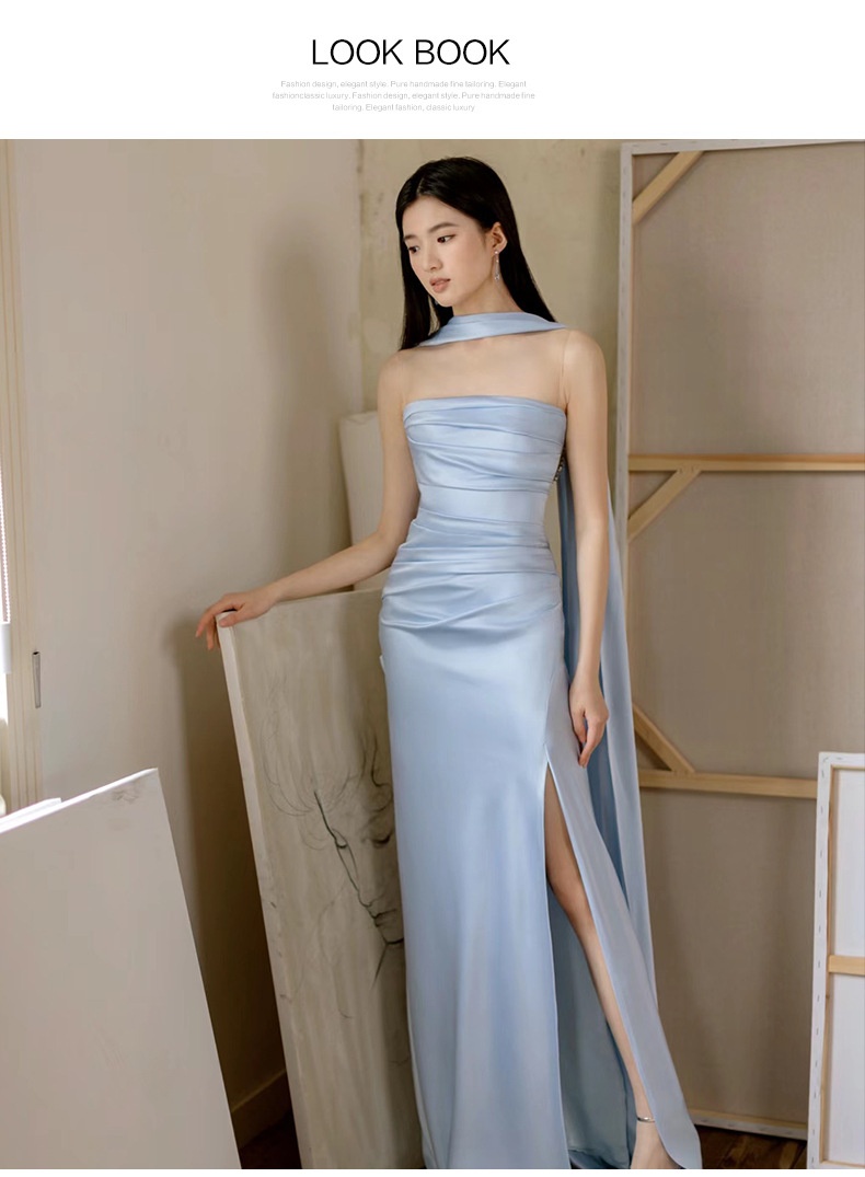 High-end Luxe Yet Understated Blue Strapless Evening Gown For Women