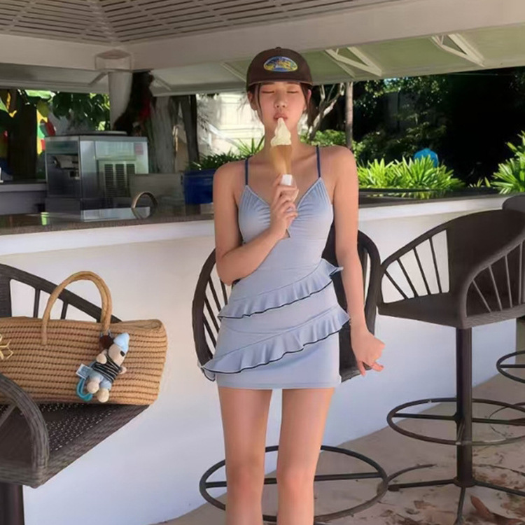 Korean Creamy-Style Conservative Ruffle Cake Dress For Women