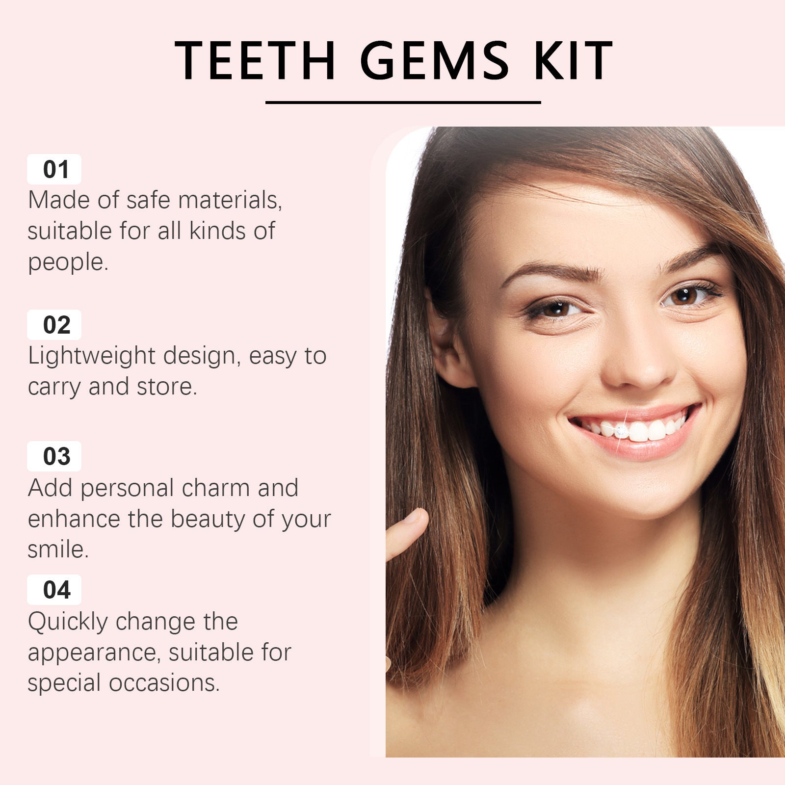 Products include: glue: 15ML * 1, precious stones pen * 1, ultraviolet lamp * 1, cotton strips * 6, tooth gem * 100