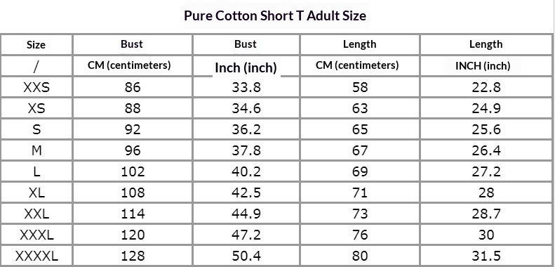 Sizes: XXS, XS, S, M, L, XL, XXL, XXXL, XXXXL